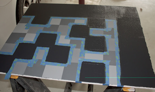 So I mixed up my primer and grout {only needed the 1 cup, it was more than enough}. Its a little difficult to get all the clumps out. I may or may not have used by handheld kitchen mixer... {I cleaned it really well though after!} Then I added a little bit of the black until I got it the light gray color I wanted. Then I started painting! I used the foam roller again to paint, it fit nicely into my squares. Here's my progress after two colors. Just remember that this project does drag on for a while because after you paint one color, remove the tape {while the paint is still wet}, let it dry and hour or more and then tape off the next color. Also each color probably had about 3 coats... sometimes I would give it about 10-15 minutes to set up before doing my final coat for that color. So its not difficult but a little time consuming with starting and stopping.